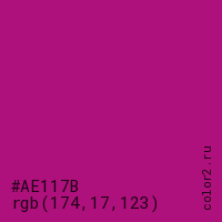 Цвет #AE117B в цветовой модели RGB обозначается тремя октетами (174, 17, 123) в десятичном формате и #AE117B в шестнадцатиричном (hex) формате, которые являются интенсивностью красного 174 (hex AE), интенсивность зелёного 17 (hex 11) и интенсивность синего 123 (hex 7B).