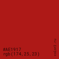 Цвет #AE1917 в цветовой модели RGB обозначается тремя октетами (174, 25, 23) в десятичном формате и #AE1917 в шестнадцатиричном (hex) формате, которые являются интенсивностью красного 174 (hex AE), интенсивность зелёного 25 (hex 19) и интенсивность синего 23 (hex 17).