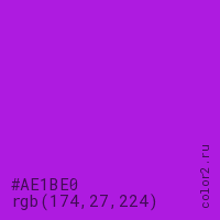 Цвет #AE1BE0 в цветовой модели RGB обозначается тремя октетами (174, 27, 224) в десятичном формате и #AE1BE0 в шестнадцатиричном (hex) формате, которые являются интенсивностью красного 174 (hex AE), интенсивность зелёного 27 (hex 1B) и интенсивность синего 224 (hex E0).
