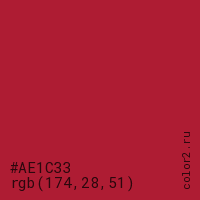 Цвет #AE1C33 в цветовой модели RGB обозначается тремя октетами (174, 28, 51) в десятичном формате и #AE1C33 в шестнадцатиричном (hex) формате, которые являются интенсивностью красного 174 (hex AE), интенсивность зелёного 28 (hex 1C) и интенсивность синего 51 (hex 33).