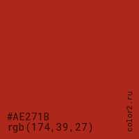 Цвет #AE271B в цветовой модели RGB обозначается тремя октетами (174, 39, 27) в десятичном формате и #AE271B в шестнадцатиричном (hex) формате, которые являются интенсивностью красного 174 (hex AE), интенсивность зелёного 39 (hex 27) и интенсивность синего 27 (hex 1B).