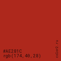 Цвет #AE281C в цветовой модели RGB обозначается тремя октетами (174, 40, 28) в десятичном формате и #AE281C в шестнадцатиричном (hex) формате, которые являются интенсивностью красного 174 (hex AE), интенсивность зелёного 40 (hex 28) и интенсивность синего 28 (hex 1C).