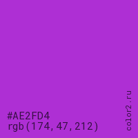 Цвет #AE2FD4 в цветовой модели RGB обозначается тремя октетами (174, 47, 212) в десятичном формате и #AE2FD4 в шестнадцатиричном (hex) формате, которые являются интенсивностью красного 174 (hex AE), интенсивность зелёного 47 (hex 2F) и интенсивность синего 212 (hex D4).