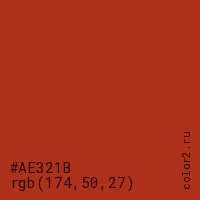Цвет #AE321B в цветовой модели RGB обозначается тремя октетами (174, 50, 27) в десятичном формате и #AE321B в шестнадцатиричном (hex) формате, которые являются интенсивностью красного 174 (hex AE), интенсивность зелёного 50 (hex 32) и интенсивность синего 27 (hex 1B).