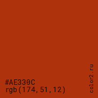 Цвет #AE330C в цветовой модели RGB обозначается тремя октетами (174, 51, 12) в десятичном формате и #AE330C в шестнадцатиричном (hex) формате, которые являются интенсивностью красного 174 (hex AE), интенсивность зелёного 51 (hex 33) и интенсивность синего 12 (hex 0C).