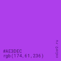 Цвет #AE3DEC в цветовой модели RGB обозначается тремя октетами (174, 61, 236) в десятичном формате и #AE3DEC в шестнадцатиричном (hex) формате, которые являются интенсивностью красного 174 (hex AE), интенсивность зелёного 61 (hex 3D) и интенсивность синего 236 (hex EC).