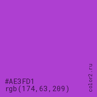 Цвет #AE3FD1 в цветовой модели RGB обозначается тремя октетами (174, 63, 209) в десятичном формате и #AE3FD1 в шестнадцатиричном (hex) формате, которые являются интенсивностью красного 174 (hex AE), интенсивность зелёного 63 (hex 3F) и интенсивность синего 209 (hex D1).