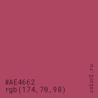 Цвет #AE4662 в цветовой модели RGB обозначается тремя октетами (174, 70, 98) в десятичном формате и #AE4662 в шестнадцатиричном (hex) формате, которые являются интенсивностью красного 174 (hex AE), интенсивность зелёного 70 (hex 46) и интенсивность синего 98 (hex 62).