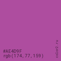 Цвет #AE4D9F в цветовой модели RGB обозначается тремя октетами (174, 77, 159) в десятичном формате и #AE4D9F в шестнадцатиричном (hex) формате, которые являются интенсивностью красного 174 (hex AE), интенсивность зелёного 77 (hex 4D) и интенсивность синего 159 (hex 9F).