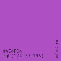 Цвет #AE4FC4 в цветовой модели RGB обозначается тремя октетами (174, 79, 196) в десятичном формате и #AE4FC4 в шестнадцатиричном (hex) формате, которые являются интенсивностью красного 174 (hex AE), интенсивность зелёного 79 (hex 4F) и интенсивность синего 196 (hex C4).