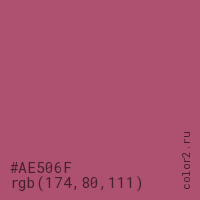 Цвет #AE506F в цветовой модели RGB обозначается тремя октетами (174, 80, 111) в десятичном формате и #AE506F в шестнадцатиричном (hex) формате, которые являются интенсивностью красного 174 (hex AE), интенсивность зелёного 80 (hex 50) и интенсивность синего 111 (hex 6F).