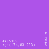 Цвет RGB(174, 83, 233) в процентом отношении количества цвета состоит из 68.2% красного (red), 32.5% зелёного (green) и 91.4% синего (blue).
