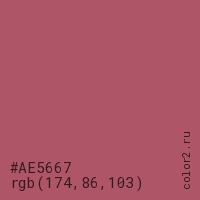 Цвет #AE5667 в цветовой модели RGB обозначается тремя октетами (174, 86, 103) в десятичном формате и #AE5667 в шестнадцатиричном (hex) формате, которые являются интенсивностью красного 174 (hex AE), интенсивность зелёного 86 (hex 56) и интенсивность синего 103 (hex 67).