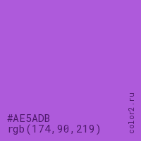 Цвет #AE5ADB в цветовой модели RGB обозначается тремя октетами (174, 90, 219) в десятичном формате и #AE5ADB в шестнадцатиричном (hex) формате, которые являются интенсивностью красного 174 (hex AE), интенсивность зелёного 90 (hex 5A) и интенсивность синего 219 (hex DB).