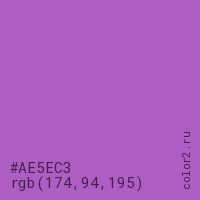 Цвет #AE5EC3 в цветовой модели RGB обозначается тремя октетами (174, 94, 195) в десятичном формате и #AE5EC3 в шестнадцатиричном (hex) формате, которые являются интенсивностью красного 174 (hex AE), интенсивность зелёного 94 (hex 5E) и интенсивность синего 195 (hex C3).