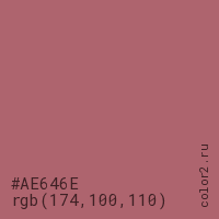 Цвет #AE646E в цветовой модели RGB обозначается тремя октетами (174, 100, 110) в десятичном формате и #AE646E в шестнадцатиричном (hex) формате, которые являются интенсивностью красного 174 (hex AE), интенсивность зелёного 100 (hex 64) и интенсивность синего 110 (hex 6E).