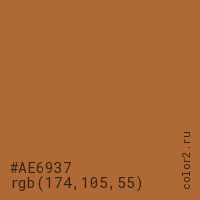 Цвет #AE6937 в цветовой модели RGB обозначается тремя октетами (174, 105, 55) в десятичном формате и #AE6937 в шестнадцатиричном (hex) формате, которые являются интенсивностью красного 174 (hex AE), интенсивность зелёного 105 (hex 69) и интенсивность синего 55 (hex 37).