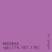 Цвет #AE6BAA в цветовой модели RGB обозначается тремя октетами (174, 107, 170) в десятичном формате и #AE6BAA в шестнадцатиричном (hex) формате, которые являются интенсивностью красного 174 (hex AE), интенсивность зелёного 107 (hex 6B) и интенсивность синего 170 (hex AA).