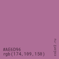 Цвет #AE6D96 в цветовой модели RGB обозначается тремя октетами (174, 109, 150) в десятичном формате и #AE6D96 в шестнадцатиричном (hex) формате, которые являются интенсивностью красного 174 (hex AE), интенсивность зелёного 109 (hex 6D) и интенсивность синего 150 (hex 96).