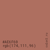 Цвет #AE6F60 в цветовой модели RGB обозначается тремя октетами (174, 111, 96) в десятичном формате и #AE6F60 в шестнадцатиричном (hex) формате, которые являются интенсивностью красного 174 (hex AE), интенсивность зелёного 111 (hex 6F) и интенсивность синего 96 (hex 60).