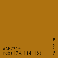Цвет #AE7210 в цветовой модели RGB обозначается тремя октетами (174, 114, 16) в десятичном формате и #AE7210 в шестнадцатиричном (hex) формате, которые являются интенсивностью красного 174 (hex AE), интенсивность зелёного 114 (hex 72) и интенсивность синего 16 (hex 10).