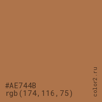 Цвет #AE744B в цветовой модели RGB обозначается тремя октетами (174, 116, 75) в десятичном формате и #AE744B в шестнадцатиричном (hex) формате, которые являются интенсивностью красного 174 (hex AE), интенсивность зелёного 116 (hex 74) и интенсивность синего 75 (hex 4B).