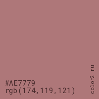 Цвет #AE7779 в цветовой модели RGB обозначается тремя октетами (174, 119, 121) в десятичном формате и #AE7779 в шестнадцатиричном (hex) формате, которые являются интенсивностью красного 174 (hex AE), интенсивность зелёного 119 (hex 77) и интенсивность синего 121 (hex 79).