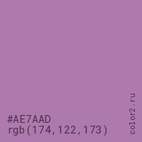 Цвет #AE7AAD в цветовой модели RGB обозначается тремя октетами (174, 122, 173) в десятичном формате и #AE7AAD в шестнадцатиричном (hex) формате, которые являются интенсивностью красного 174 (hex AE), интенсивность зелёного 122 (hex 7A) и интенсивность синего 173 (hex AD).