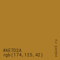 Цвет #AE7D2A в цветовой модели RGB обозначается тремя октетами (174, 125, 42) в десятичном формате и #AE7D2A в шестнадцатиричном (hex) формате, которые являются интенсивностью красного 174 (hex AE), интенсивность зелёного 125 (hex 7D) и интенсивность синего 42 (hex 2A).