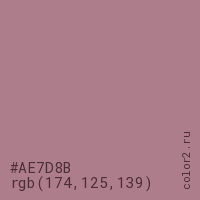 Цвет #AE7D8B в цветовой модели RGB обозначается тремя октетами (174, 125, 139) в десятичном формате и #AE7D8B в шестнадцатиричном (hex) формате, которые являются интенсивностью красного 174 (hex AE), интенсивность зелёного 125 (hex 7D) и интенсивность синего 139 (hex 8B).