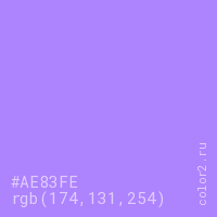 Цвет #AE83FE в цветовой модели RGB обозначается тремя октетами (174, 131, 254) в десятичном формате и #AE83FE в шестнадцатиричном (hex) формате, которые являются интенсивностью красного 174 (hex AE), интенсивность зелёного 131 (hex 83) и интенсивность синего 254 (hex FE).