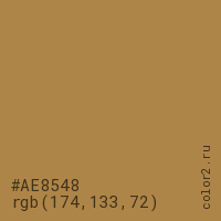Цвет #AE8548 в цветовой модели RGB обозначается тремя октетами (174, 133, 72) в десятичном формате и #AE8548 в шестнадцатиричном (hex) формате, которые являются интенсивностью красного 174 (hex AE), интенсивность зелёного 133 (hex 85) и интенсивность синего 72 (hex 48).