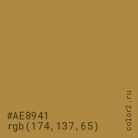 Цвет #AE8941 в цветовой модели RGB обозначается тремя октетами (174, 137, 65) в десятичном формате и #AE8941 в шестнадцатиричном (hex) формате, которые являются интенсивностью красного 174 (hex AE), интенсивность зелёного 137 (hex 89) и интенсивность синего 65 (hex 41).