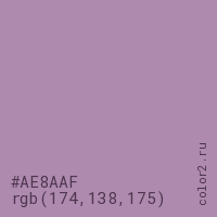 Цвет #AE8AAF в цветовой модели RGB обозначается тремя октетами (174, 138, 175) в десятичном формате и #AE8AAF в шестнадцатиричном (hex) формате, которые являются интенсивностью красного 174 (hex AE), интенсивность зелёного 138 (hex 8A) и интенсивность синего 175 (hex AF).
