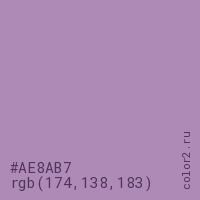 Цвет #AE8AB7 в цветовой модели RGB обозначается тремя октетами (174, 138, 183) в десятичном формате и #AE8AB7 в шестнадцатиричном (hex) формате, которые являются интенсивностью красного 174 (hex AE), интенсивность зелёного 138 (hex 8A) и интенсивность синего 183 (hex B7).