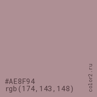Цвет #AE8F94 в цветовой модели RGB обозначается тремя октетами (174, 143, 148) в десятичном формате и #AE8F94 в шестнадцатиричном (hex) формате, которые являются интенсивностью красного 174 (hex AE), интенсивность зелёного 143 (hex 8F) и интенсивность синего 148 (hex 94).