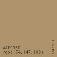 Цвет #AE936D в цветовой модели RGB обозначается тремя октетами (174, 147, 109) в десятичном формате и #AE936D в шестнадцатиричном (hex) формате, которые являются интенсивностью красного 174 (hex AE), интенсивность зелёного 147 (hex 93) и интенсивность синего 109 (hex 6D).