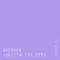 Цвет #AE99EB в цветовой модели RGB обозначается тремя октетами (174, 153, 235) в десятичном формате и #AE99EB в шестнадцатиричном (hex) формате, которые являются интенсивностью красного 174 (hex AE), интенсивность зелёного 153 (hex 99) и интенсивность синего 235 (hex EB).
