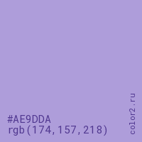 Цвет #AE9DDA в цветовой модели RGB обозначается тремя октетами (174, 157, 218) в десятичном формате и #AE9DDA в шестнадцатиричном (hex) формате, которые являются интенсивностью красного 174 (hex AE), интенсивность зелёного 157 (hex 9D) и интенсивность синего 218 (hex DA).