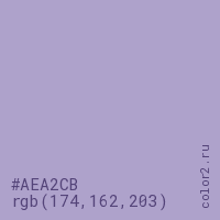 Цвет #AEA2CB в цветовой модели RGB обозначается тремя октетами (174, 162, 203) в десятичном формате и #AEA2CB в шестнадцатиричном (hex) формате, которые являются интенсивностью красного 174 (hex AE), интенсивность зелёного 162 (hex A2) и интенсивность синего 203 (hex CB).
