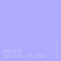 Цвет #AEAAFD в цветовой модели RGB обозначается тремя октетами (174, 170, 253) в десятичном формате и #AEAAFD в шестнадцатиричном (hex) формате, которые являются интенсивностью красного 174 (hex AE), интенсивность зелёного 170 (hex AA) и интенсивность синего 253 (hex FD).