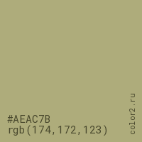 Цвет #AEAC7B в цветовой модели RGB обозначается тремя октетами (174, 172, 123) в десятичном формате и #AEAC7B в шестнадцатиричном (hex) формате, которые являются интенсивностью красного 174 (hex AE), интенсивность зелёного 172 (hex AC) и интенсивность синего 123 (hex 7B).