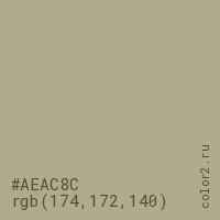 Цвет #AEAC8C в цветовой модели RGB обозначается тремя октетами (174, 172, 140) в десятичном формате и #AEAC8C в шестнадцатиричном (hex) формате, которые являются интенсивностью красного 174 (hex AE), интенсивность зелёного 172 (hex AC) и интенсивность синего 140 (hex 8C).