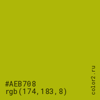 Цвет #AEB708 в цветовой модели RGB обозначается тремя октетами (174, 183, 8) в десятичном формате и #AEB708 в шестнадцатиричном (hex) формате, которые являются интенсивностью красного 174 (hex AE), интенсивность зелёного 183 (hex B7) и интенсивность синего 8 (hex 08).