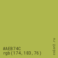 Цвет #AEB74C в цветовой модели RGB обозначается тремя октетами (174, 183, 76) в десятичном формате и #AEB74C в шестнадцатиричном (hex) формате, которые являются интенсивностью красного 174 (hex AE), интенсивность зелёного 183 (hex B7) и интенсивность синего 76 (hex 4C).