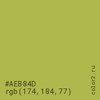 Цвет #AEB84D в цветовой модели RGB обозначается тремя октетами (174, 184, 77) в десятичном формате и #AEB84D в шестнадцатиричном (hex) формате, которые являются интенсивностью красного 174 (hex AE), интенсивность зелёного 184 (hex B8) и интенсивность синего 77 (hex 4D).