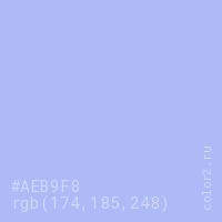 Цвет #AEB9F8 в цветовой модели RGB обозначается тремя октетами (174, 185, 248) в десятичном формате и #AEB9F8 в шестнадцатиричном (hex) формате, которые являются интенсивностью красного 174 (hex AE), интенсивность зелёного 185 (hex B9) и интенсивность синего 248 (hex F8).