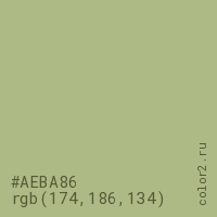 Цвет #AEBA86 в цветовой модели RGB обозначается тремя октетами (174, 186, 134) в десятичном формате и #AEBA86 в шестнадцатиричном (hex) формате, которые являются интенсивностью красного 174 (hex AE), интенсивность зелёного 186 (hex BA) и интенсивность синего 134 (hex 86).