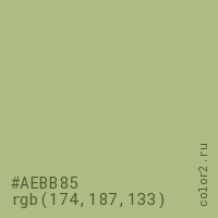 Цвет #AEBB85 в цветовой модели RGB обозначается тремя октетами (174, 187, 133) в десятичном формате и #AEBB85 в шестнадцатиричном (hex) формате, которые являются интенсивностью красного 174 (hex AE), интенсивность зелёного 187 (hex BB) и интенсивность синего 133 (hex 85).