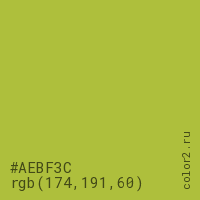 Цвет #AEBF3C в цветовой модели RGB обозначается тремя октетами (174, 191, 60) в десятичном формате и #AEBF3C в шестнадцатиричном (hex) формате, которые являются интенсивностью красного 174 (hex AE), интенсивность зелёного 191 (hex BF) и интенсивность синего 60 (hex 3C).